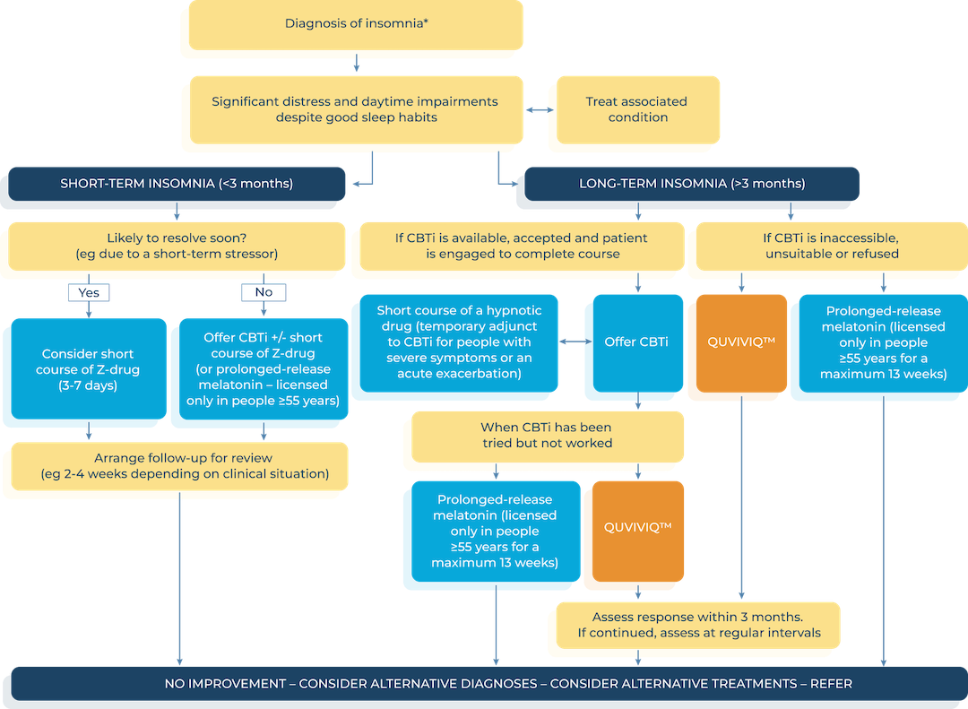- National Institute for Health and Care Excellence (NICE). Clinical knowledge summary. Insomnia. Scenario: managing long-term insomnia (more than 3 months duration), May 2025. Available at: cks.nice.org.uk. Accessed August 2025