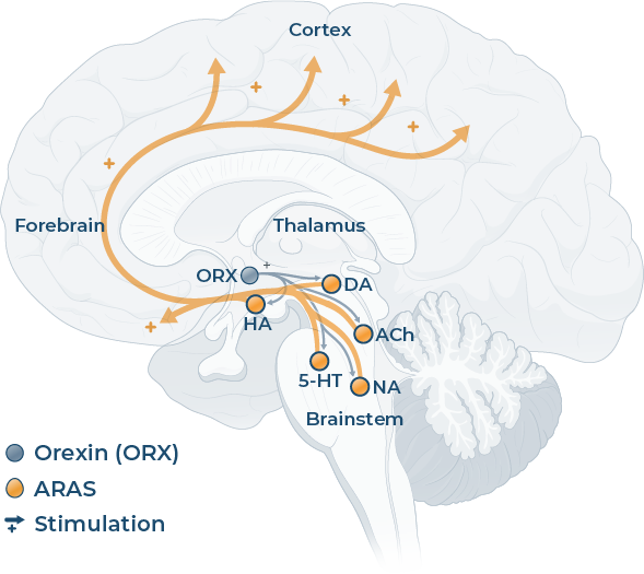The neuropeptide orexin further maintains wakefulness by reinforcing the activity of the wake‑promoting neurotransmitters involved in ARAS during the day.7-10